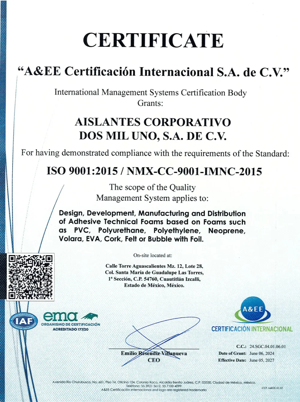 Alcance de Certificación: Diseño, Desarrollo, Fabricación y Distribución de Espumas Técnicas Adhesivas a base de espumas de PVC, Poliuretano, Polietileno, Neopreno, Volara, EVA, Corcho, Fieltro o Burbuja con Foil.